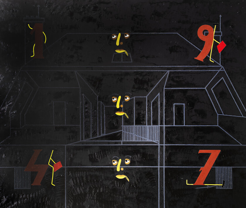 Venta de una obra de pintura contemporánea titulada "La Casa de Manolete", un lienzo creado en 1995 por el reconocido artista Eduardo Arroyo. La obra se encuentra actualmente ubicada en Madrid.